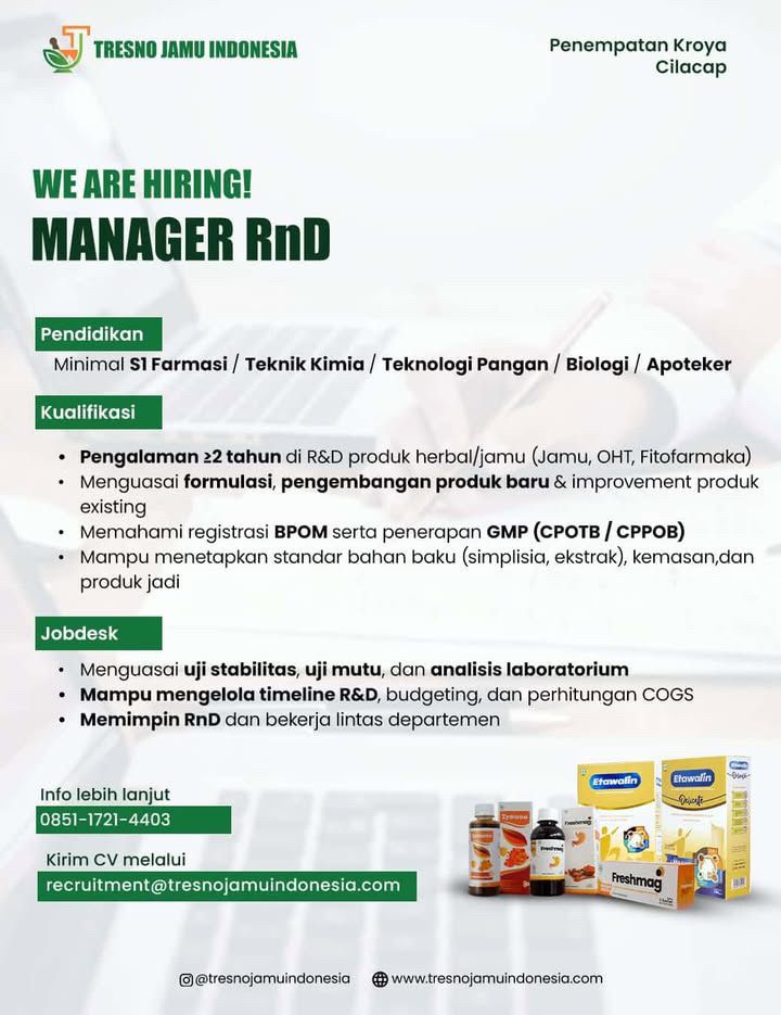 Manager RnD PT Tresno Jamu Indonesia